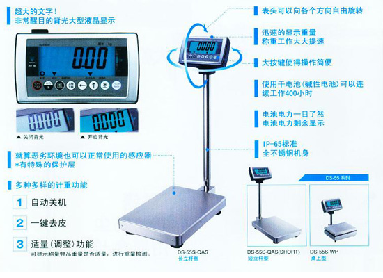 DS-55不銹鋼數(shù)字臺秤、 防水型設計、IP-65標準全不銹鋼機身 高強度機身、堅固耐用;特別針對有水作業(yè)區(qū):防水、防銹、耐腐蝕 灰塵封閉 快速且超大的數(shù)字顯示,非常醒目的背光大型液晶顯示 表頭可以向各個方向自由旋轉(zhuǎn) 大按鍵方便操作 電池電量顯示一目了然 自動關機功能 一鍵去皮功能 適量調(diào)整功能
